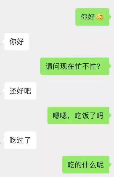 这是因为你缺少一定的聊天技巧,不会向妹子展示自己,聊天时往往是这样的画风: